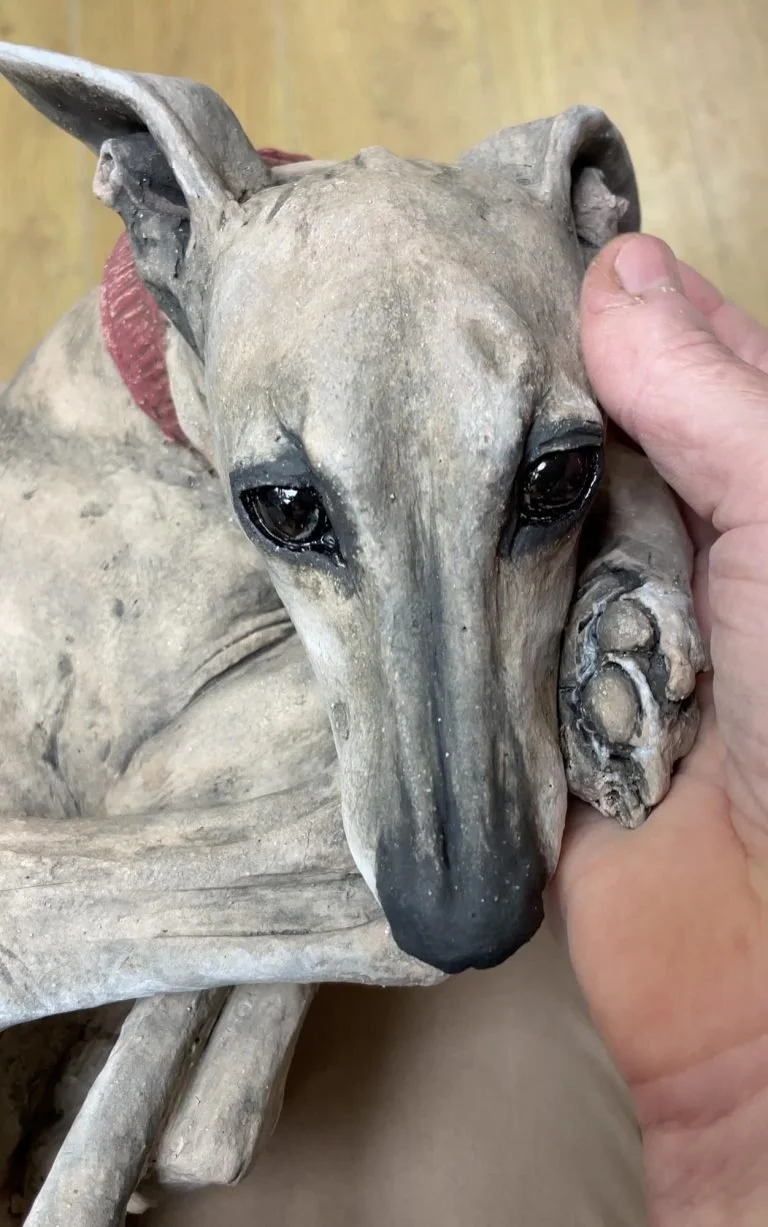 I sent my client regular photo and video updates as Ellie the whippet dog sculpture progressed. This is something I always do. It means clients can share in the creative process and provide feedback as their sculptures take shape. This is an emotional process not only for the client but for me too! A memorial sculpture needs to capture the spirit of the animal. I can’t help getting emotionally invested in the process. Naturally, all this takes time. In terms of observation and detailing, my pet sculpture commissions are among the most challenging I undertake.
